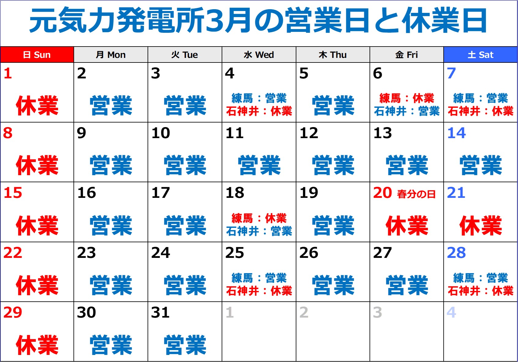 ◇3月の営業日・休業日カレンダー 営業時間10:30~17:30